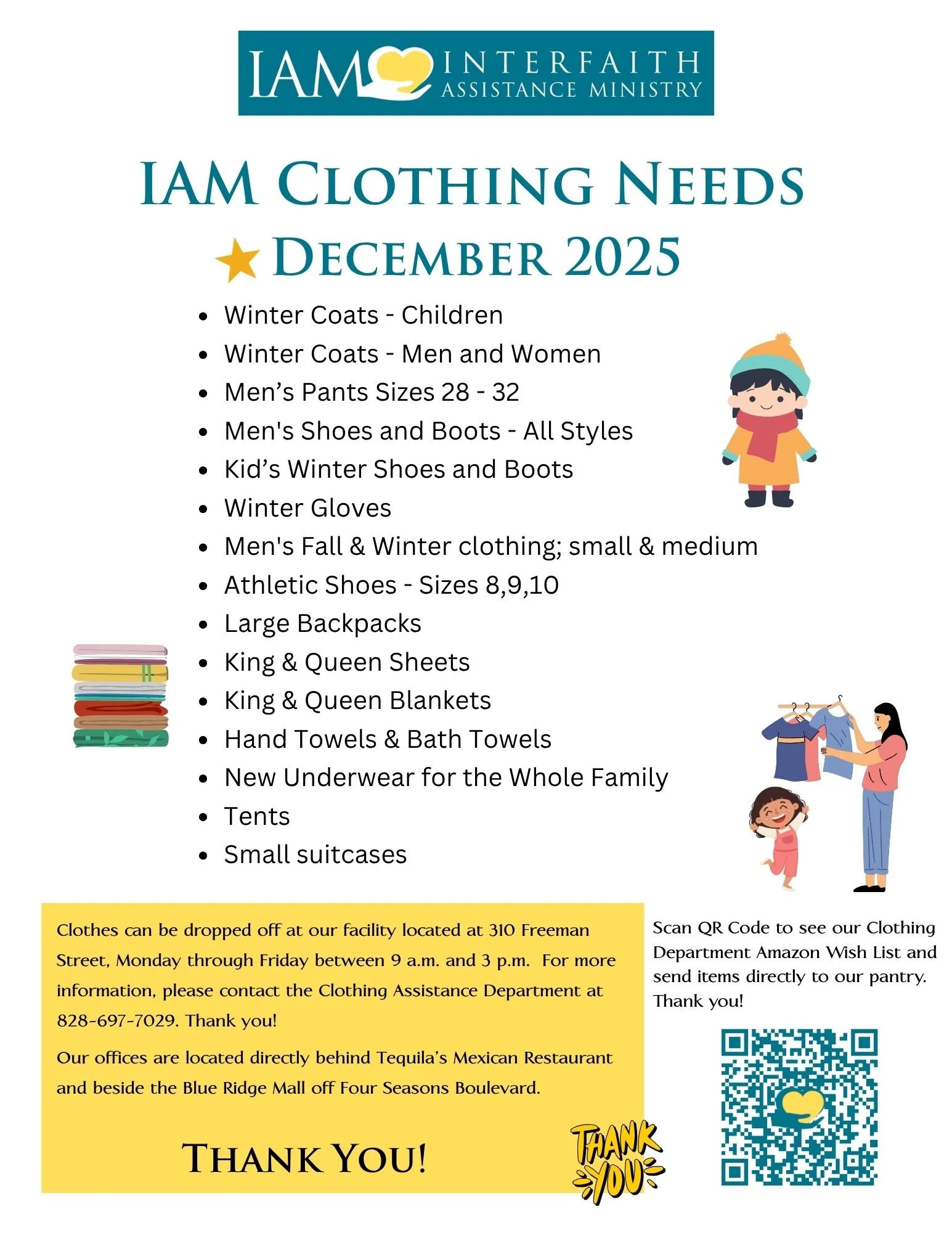 Food and clothes can be dropped off at our facility located at 310 Freeman Street at the following times: