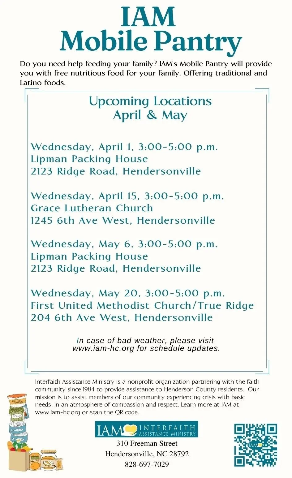 Do you need help feeding your family? IAM's Mobile Pantry will provide you with free nutritious food for a week for each member of your family. Offering traditional and Latino foods.
